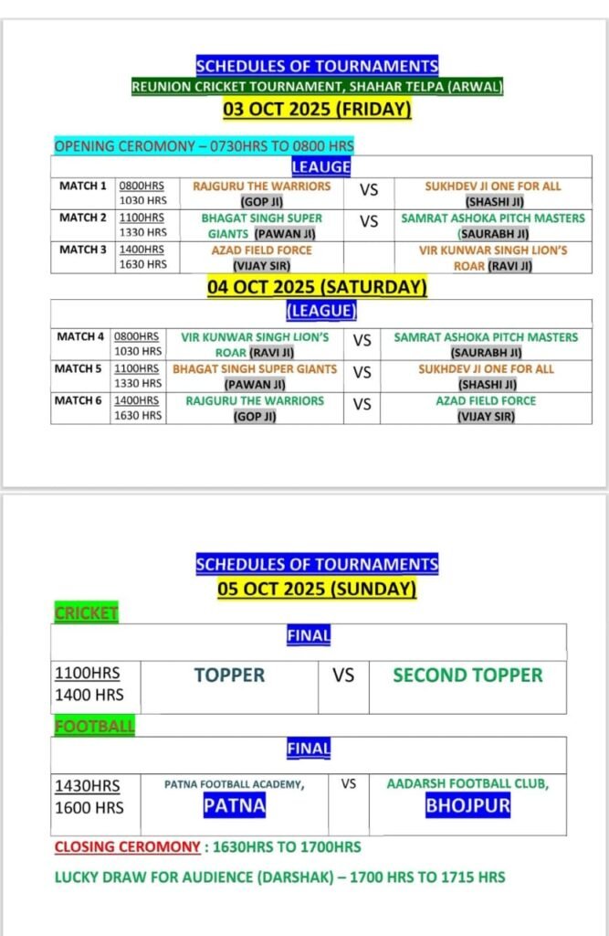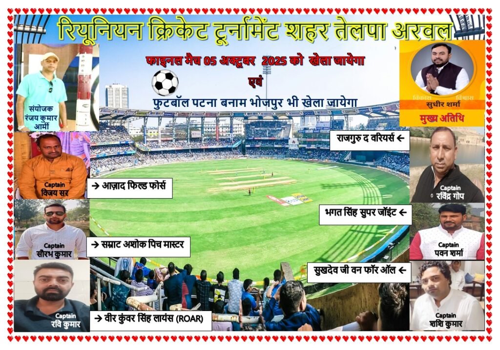 अरवल जिले के शहर तेलपा खेल मैदान में रियूनियन क्रिकेट टूर्नामेंट का आयोजन किया गया है। प्रतियोगिता में दोनों जिलों के सीमावर्ती क्षेत्रों में खेलने वाले तीस वर्ष से ऊपर उम्र के ही क्रिकेट खिलाड़ी शामिल होंगे। प्रतियोगिता में कुल छः टीम भाग लेगी। वहीं टूर्नामेंट का उद्घाटन मैच तीन अक्टूबर से प्रारंभ होगी जबकि फाइनल मुकाबला पांच अक्टूबर को खेला जाएगा। साथ ही आयोजकों द्वारा फाइनल मुकाबले के दिन एक राउंड फुटबॉल मैच पटना बनाम भोजपुर के बीच खेला जाएगा। दोनों जिलों के लगभग दो दर्जन से अधिक गांवों के खिलाड़ी शामिल होंगे। टूर्नामेंट संयोजक भारतीय सैनिक रंजय कुमार ने बताया कि टूर्नामेंट के जरिए खेल को बढ़ावा देना है। वहीं पूर्व खिलाड़ियों का एक साथ पुनर्मिलन होगा जिससे वर्तमान खिलाड़ियों को प्रेरणा मिलेगी।