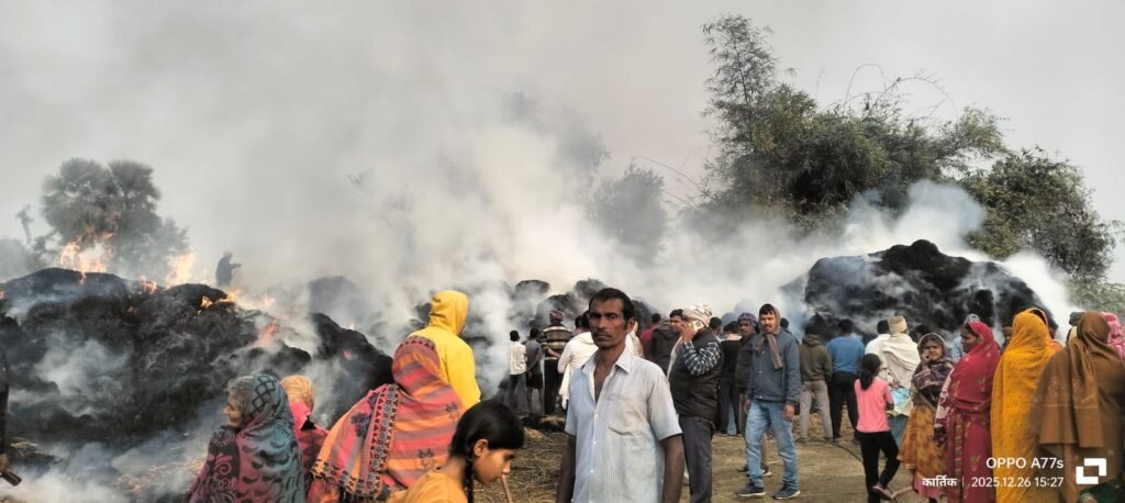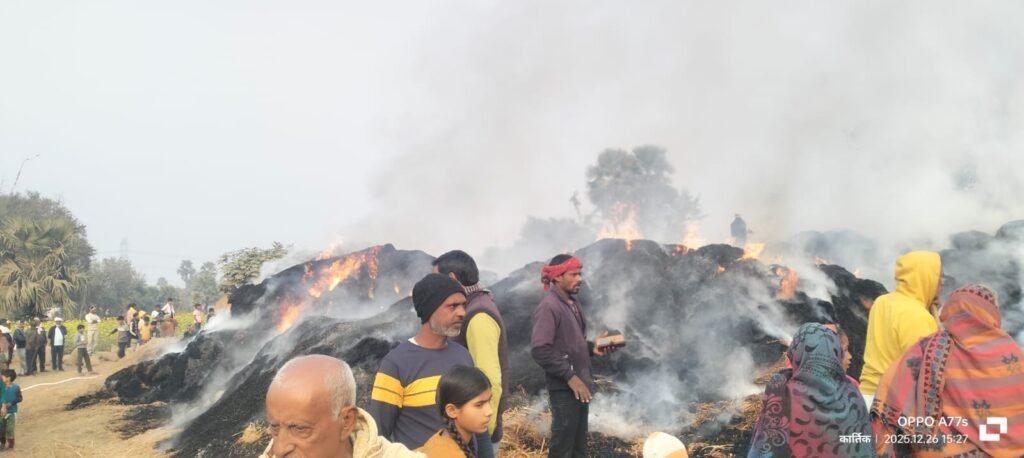 मिली जानकारी के अनुसार, शुक्रवार की शाम अनंत बिगहा निवासी किसान बालानंद यादव अपने खेत में ट्रैक्टर से धान की कटाई कर रहे थे। इसी दौरान अचानक ट्रैक्टर के साइलेंसर (इंजन) से निकली एक चिंगारी पास ही रखे पुआल के ढेर पर जा गिरी। सूखे पुआल ने तुरंत आग पकड़ ली और पछुआ हवा के कारण लपटें बेकाबू हो गईं।