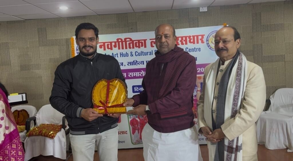 औरंगाबाद जिले के गोह प्रखंड का मान बढ़ाते हुए, अमारी ग्राम निवासी निगम नारायण शर्मा को राजधानी पटना में आयोजित एक भव्य समारोह में ‘युवा संवाददाता सम्मान’ से नवाजा गया है। सोमवार को ‘नवगीतिका लोकरसधार’ के वार्षिकोत्सव के अवसर पर उन्हें यह प्रतिष्ठित सम्मान प्रदान किया गया।पटना के भारतीय नृत्य कला मंदिर सांस्कृतिक परिसर में आयोजित इस गरिमामयी कार्यक्रम में बिहार सरकार के कला एवं संस्कृति मंत्री श्री अरुण शंकर प्रसाद मुख्य अतिथि के रूप में उपस्थित थे। उन्होंने निगम नारायण शर्मा के पत्रकारिता के क्षेत्र में योगदान को सराहते हुए उन्हें स्मृति चिह्न (मोमेंटो) भेंट किया।