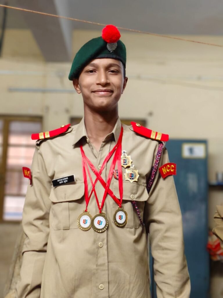 सैनिक स्कूल द्वारा सर्वश्रेष्ठ प्रदर्शन देते हुए आर्यन का चुनाव एनसीसी के लिए हुआ जहां कड़ी मेहनत और परिश्रम के बाद एनसीसी जिला स्तरीय प्रतियोगिता 2025 के लिए आर्यन को बेस्ट वेपन हैंडलिंग, बेस्ट एंकर और स्कीट लीग के लिए तीनो विधा में गोल्ड मेडल जीता है। एक साथ तीन तीन गोल्ड मेडल मिलने से आर्यन के परिवार गांव व जिले में काफी उत्साह व खुशी का माहौल है।