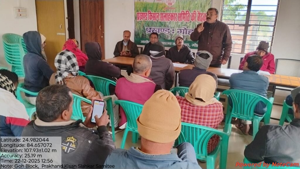 औरंगाबाद जिले के गोह प्रखंड मुख्यालय स्थित कृषि भवन में सोमवार को प्रखंड सलाहकार समिति की एक महत्वपूर्ण बैठक आयोजित की गई, जिसकी अध्यक्षता आत्मा अध्यक्ष विनय पटेल ने की। बैठक में किसानों की वर्तमान समस्याओं, सरकारी योजनाओं के क्रियान्वयन और कृषि सुविधाओं के सुदृढ़ीकरण को लेकर विस्तार से चर्चा की गई तथा कई अहम सुझावों पर विचार-विमर्श किया गया।