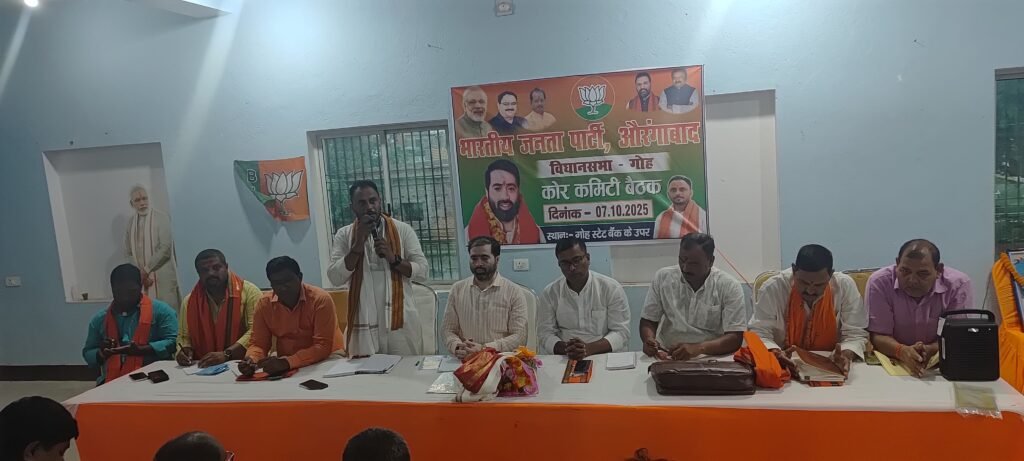 बिहार विधानसभा चुनाव की घोषणा के साथ हीं सभी राजनीतिक दल एक्शन मोड में है, औरंगाबाद जिले के गोह प्रखंड मुख्यालय स्थित एसबीआई सभागार भवन में मंगलवार की शाम गोह भाजपा की कोर कमेटी की बैठक संपन्न हुई। इस बैठक का मुख्य उद्देश्य संगठन को बूथ स्तर तक मजबूती पर विचार-विमर्श किया गया। बैठक में यूपी के खाद्य एवं आपूर्ति मंत्री सतीशचन्द्र शर्मा, जिला प्रभारी मनोज कुशवाहा, जिलाध्यक्ष विजेंद्र चंद्रवंशी, जिला महामंत्री अमन कुशवाहा, जिला उपाध्यक्ष दीपक उपाध्याय, विस प्रभारी सुबोध कुमार सिंह, जिला मंत्री सुनील शर्मा व सत्यपाल उर्फ भोला यादव सहित कई वरिष्ठ नेता उपस्थित रहे। बैठक की अध्यक्षता पूर्व जिला मंत्री रविशंकर शर्मा ने की। इस दौरान गोह विधानसभा के पांचों मंडल के अध्यक्ष, मंडल महामंत्री, मंडल प्रभारी एवं कार्यकर्ताओं ने भाग लिया। वक्ताओं ने संगठन को बूथ स्तर तक सशक्त बनाने की आवश्यकता पर जोर दिया। इस मौके पर सुधीर कुमार मिश्रा, बिकू त्रिपाठी, उमेश पासवान, राजीव कुमार विद्यार्थी, विनोद शर्मा, चंद्रकांत कुमार मुन्ना, राजकुमार चंद्रवंशी, हिरामोती शर्मा, सचिन चंद्रवंशी सहित दर्जनों लोग मौजूद रहे।